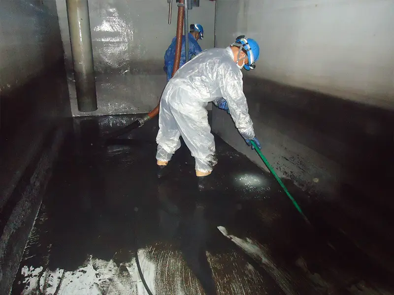 現場ごとに異なる内容物・構造に応じて、適切な機材と作業方法を選定し、薬品を使用する現場や高所・狭所での作業にも対応できる体制を整えています。